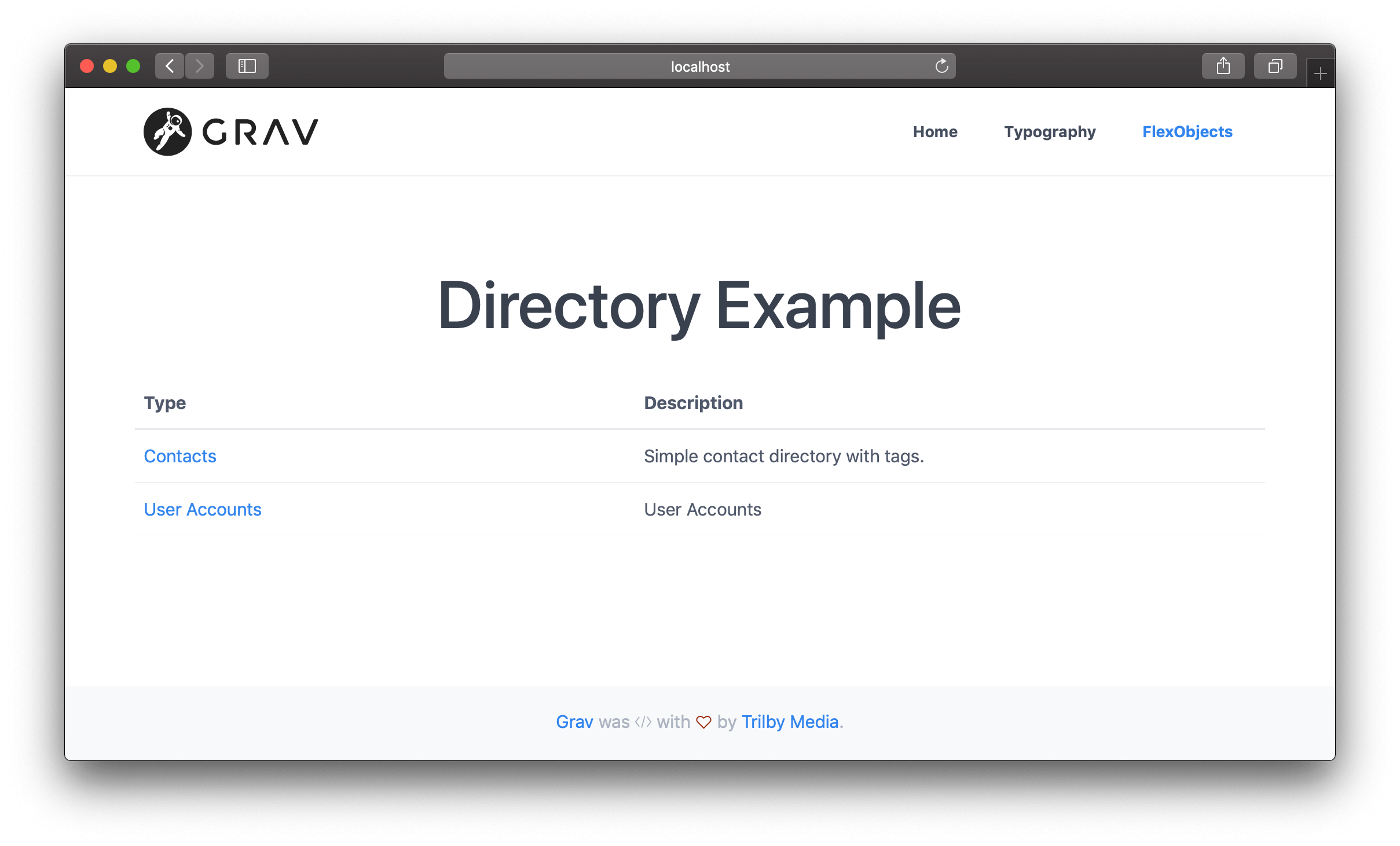 • You can also add types from your plugins by hooking into onFlexInit event (see AccountsServiceProvider in Grav)