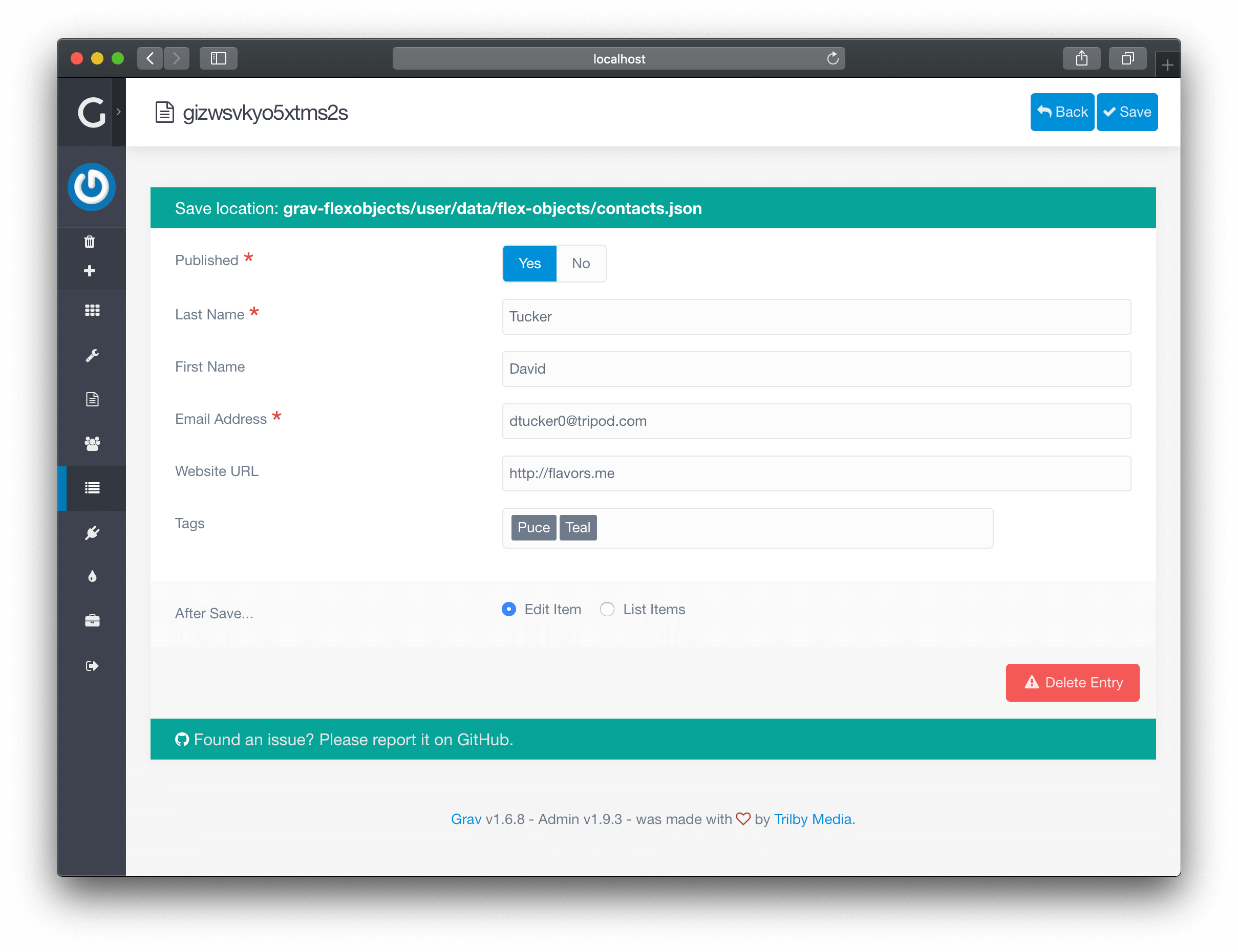 The Flex Objects Plugin is for Grav CMS. Flex objects is a powerful new plugin that allows you to build custom collections of objects, which can modified by CRUD operations via the admin plugin to easily manage large sets of data that don't make sense as simple YAML configuration files, or Grav pages. These objects are defined by blueprints written in YAML and they are rendered by a set of twig files. Additionally both objects and collections can be customized by PHP classes, which allows you to define complex behaviors and relationships between the objects.